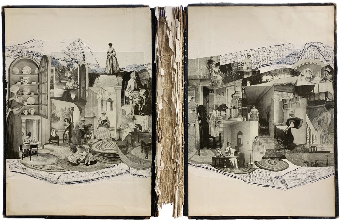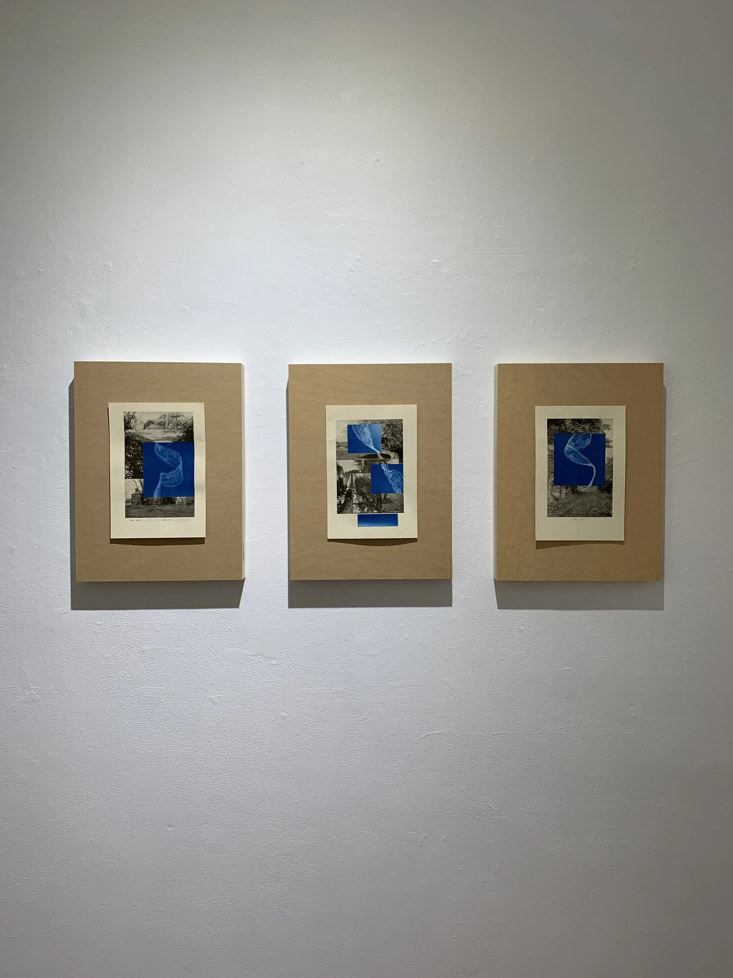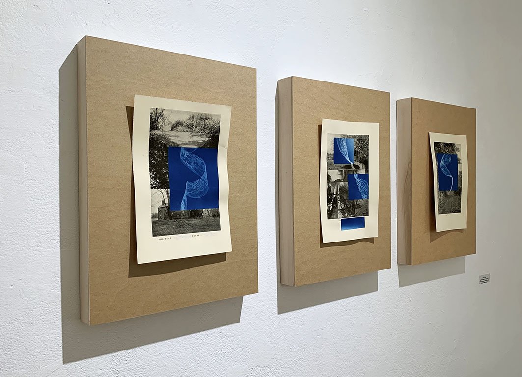 With my studio set up in the former servants’ quarters, meditations on enclosure, visibility and invisibility, gender, and domesticity guided my work. The collection of collages I produced during the residency period reflect the restrictive, gendered ideas of home as evoked in two books contemporary with the house’s early years: Men of Progress: Connecticut (1898) and Connecticut Beautiful (1922). I worked with the materials of the books—their foxed pages, their leather-clad covers, their images and words—as well as with materials of book and home making—wood, cloth, thread, kitchen paper. Cyanotypes captured the exterior light as it moved through the house and the contents of my great-grandmother’s sewing basket, marking a lace path to an exit.