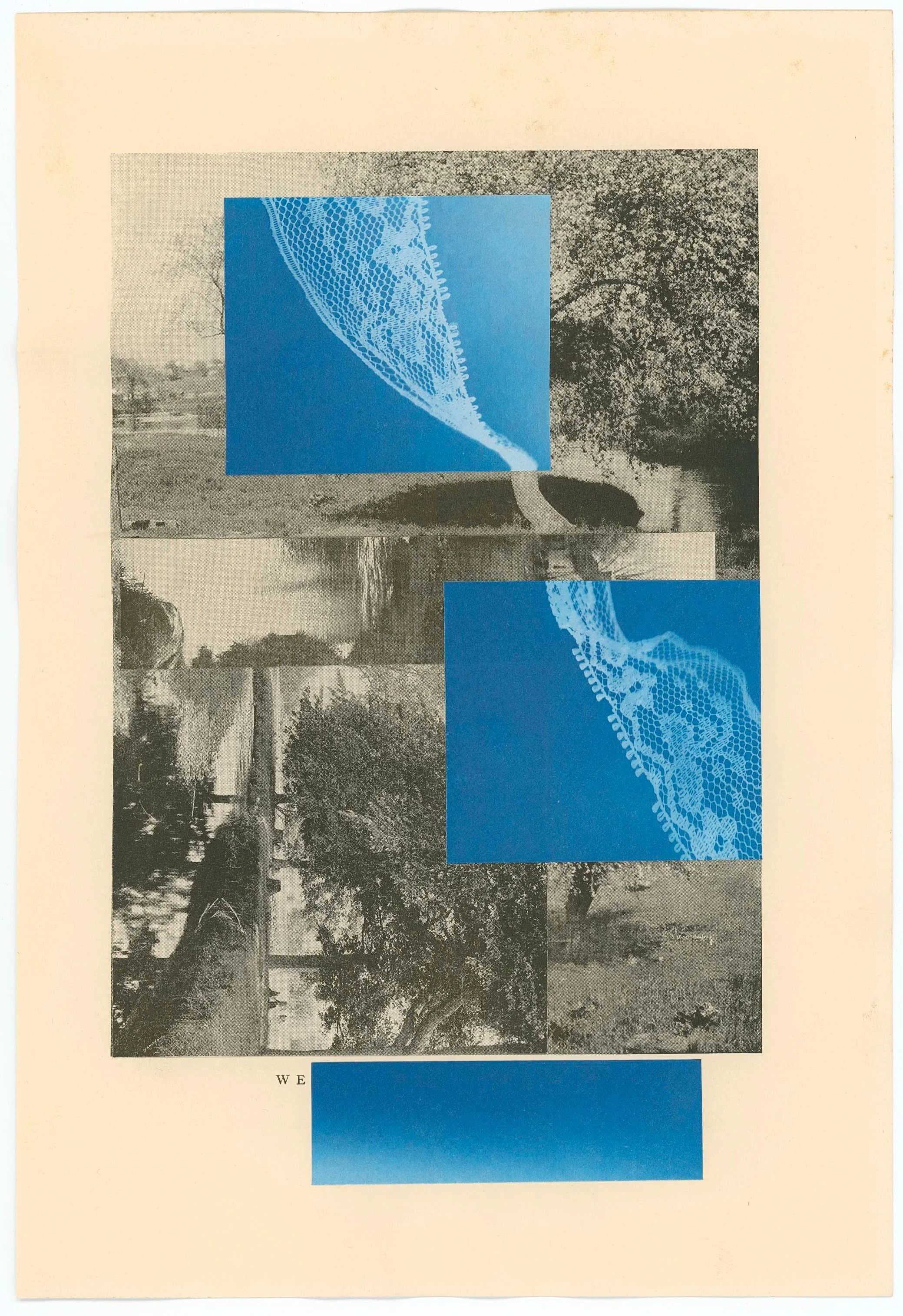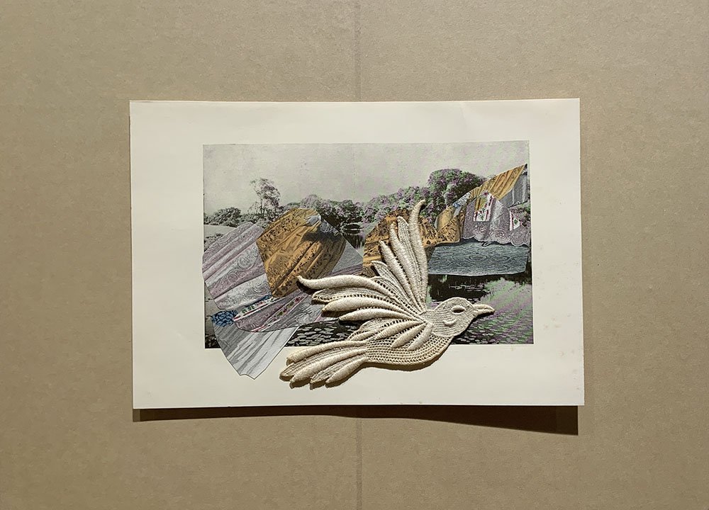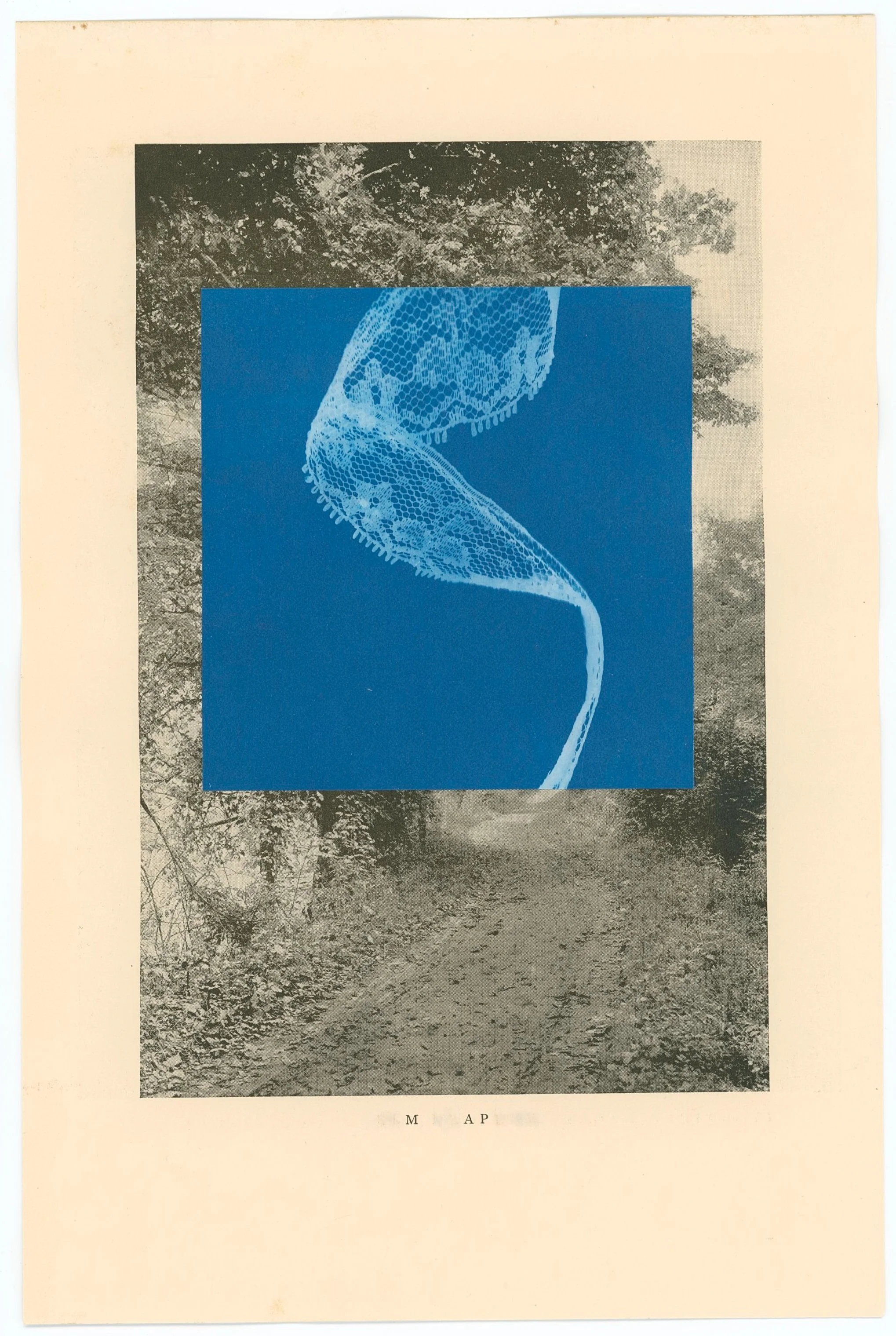 With my studio set up in the former servants’ quarters, meditations on enclosure, visibility and invisibility, gender, and domesticity guided my work. The collection of collages I produced during the residency period reflect the restrictive, gendered ideas of home as evoked in two books contemporary with the house’s early years: Men of Progress: Connecticut (1898) and Connecticut Beautiful (1922). I worked with the materials of the books—their foxed pages, their leather-clad covers, their images and words—as well as with materials of book and home making—wood, cloth, thread, kitchen paper. Cyanotypes captured the exterior light as it moved through the house and the contents of my great-grandmother’s sewing basket, marking a lace path to an exit.