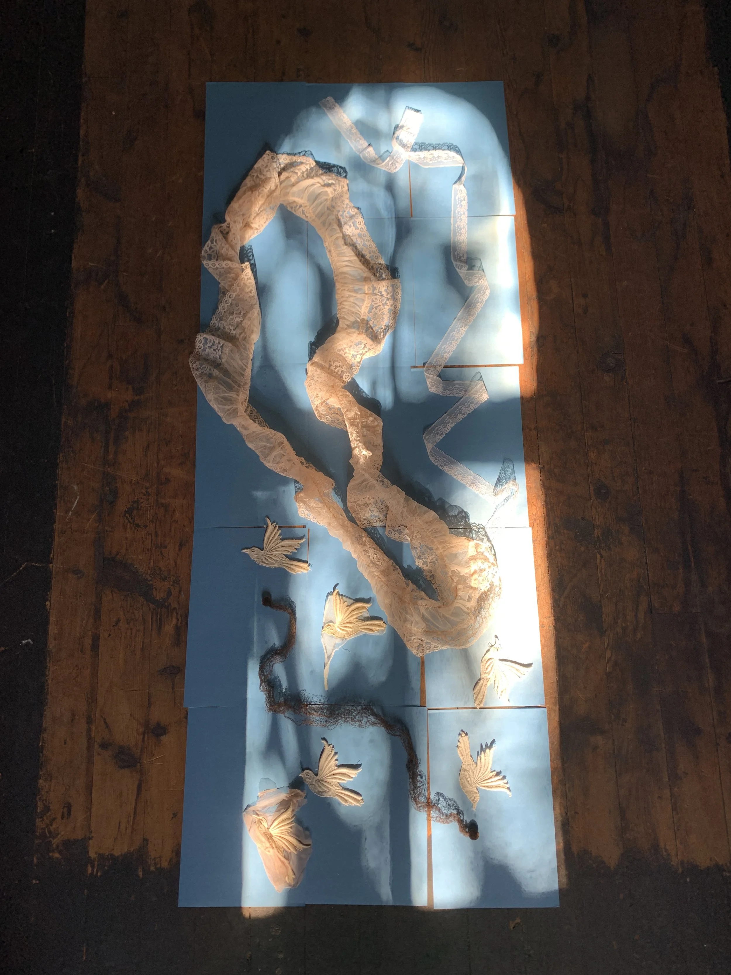 The lace that appears in the cyanotypes belonged to my great-grandmother, whose career outside the home came to a halt when she was married in the early 1900s. She lived the last years of her life in the attic of my mother’s childhood home sewing and mending clothes for the family.